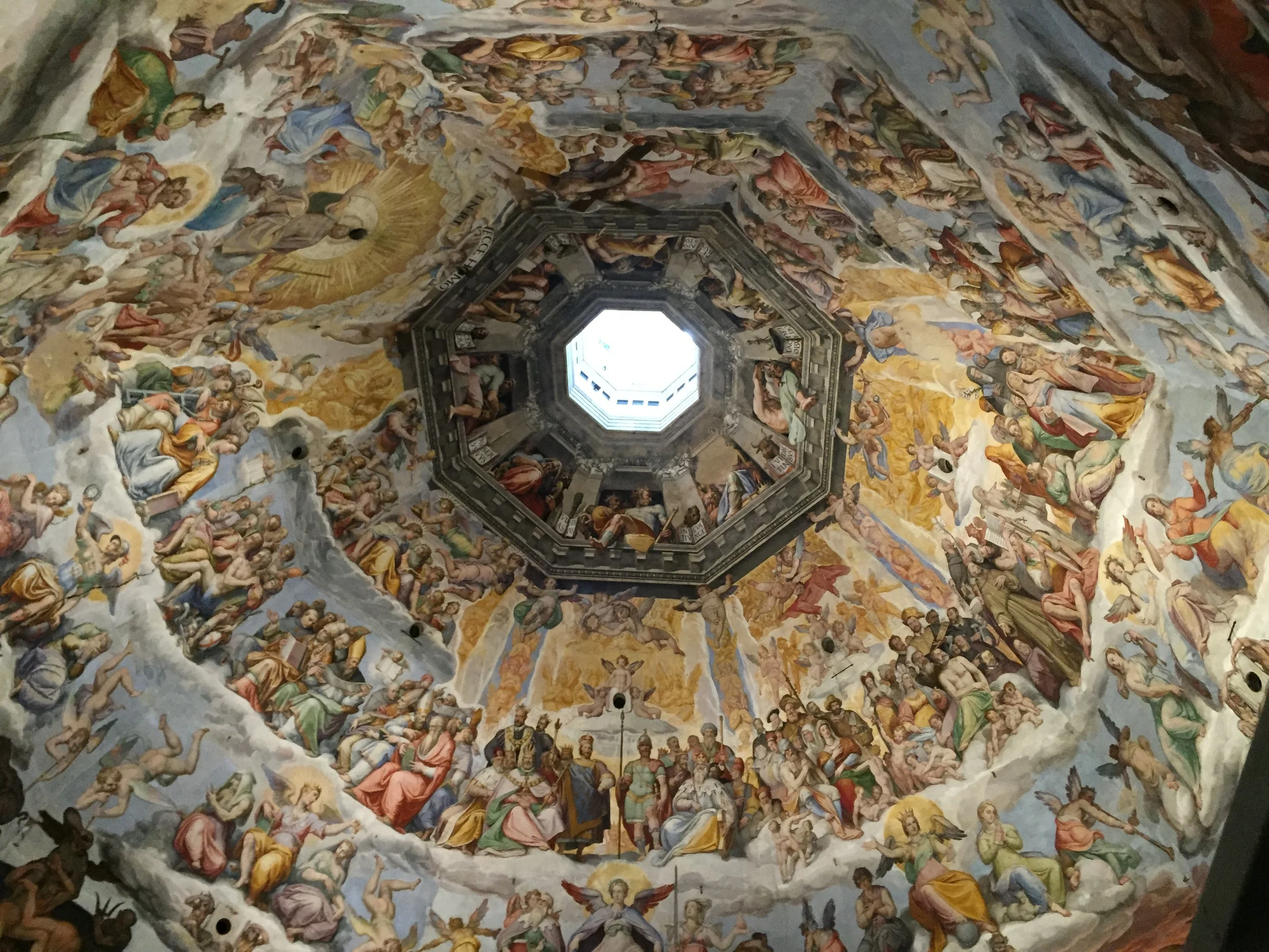 While my family and I were walking enjoying gelato and other Italian fare we noticed one peculiar thing: the usually long line for the 463 step climb to the Cupola Santa Maria del Fiore, the official name for the apex and viewing platform of the dome, was nonexistent. Quickly realizing that now was our best chance to make the climb, my Dad, Paul, my sister, Abigail, and I headed through the side entrance of the cathedral while my mom, Kelly, and my other sister, Anne Lois stayed on the ground. The climbers made it partially up the first series of stairs and part of a spiral staircase before being impeded by a slowly moving line that moved single-file up towards our goal. When we emerged from the spiral staircase into a small room, we started to wonder how high we were and how much further we had to go. We were about to find out. That room led onto a three-foot-wide walkway that wrapped around the interior of the famed dome. The stone walkway is supported by ornate stone beams that were not very convincing. With only a railing and a plexiglass wall that prevented you from falling, but still allowed you to see the entirety of the dome, and a little less fortunately, it allowed a clear view of the cathedral floor. We made our way confidently around the walkway until suddenly we came to a halt halfway between the two doors that cut the dome in half. The delay was not all bad though- it allowed us to admire the frescoes and stained glass overhead; but, they could not hold our attention forever. Eventually, my eyes slipped down to the dizzying gap between us and the horde of tiny tourists that swarmed like bees on the cathedral floor. My eyes quickly snapped up but even the ongoing battle between demons and angels above could not distract from the long drop to the floor below. Inching back, I hugged the wall and glanced over at my dad who empathetically looked back as he came to the same realization. A nerve racking twenty minutes passed by as we wished the line would continue to move forward. Finally, the line moved forward and we stepped safely through the portal that bestowed a renewed sense of security to those who passed through. We then endured a slow second half of the climb because from that point on there was only one path for both up and down. Finally, we completed the last portion of the climb where the stairs were more related to a ladder. Coming out of the trap door on the cupola, we witnessed the breathtaking view of the surrounding city. I knew without a doubt that it was well worth the climb (time spent under the dome included). Not only the view but the inner passages and architectural features of a building that were never meant to be seen by the public eye were amazing to witness. Without a doubt, the Duomo is an architectural marvel and a treasure.